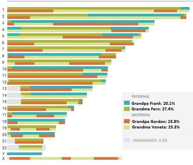After excluding these small segments, we are left with long stretches of DNA that most likely came from Frank. By subtracting the start points from the end points and adding the resulting values together we can determine a number of basepairs of autosomal DNA we are fairly confident came from Frank. Remember that I also got my Y-chromosome from Frank. I add the total length of the Y-chromosome to the number of basepairs assigned to Frank by inference and divide the resulting number by my total shared DNA. The result: I inherited about 27.4% of my DNA from Fern Laurine Stoddard, I inherited 20.1% of my DNA from Frank Alan Woodbury, and about 1.6% of my DNA is paternal DNA that cannot be assigned to either grandparent.