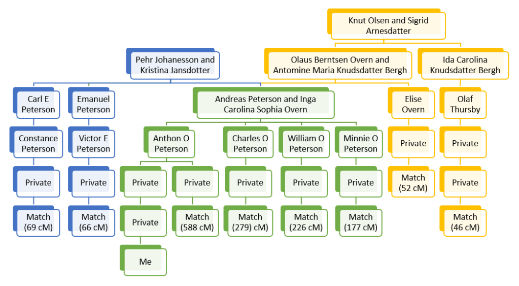 Andreas Peterson and Inga Carolina Sophia Overn were also my most recent immigrant ancestors. By the time they arrived in the United States in 1874, some of my other ancestors’ families had been here anywhere from a few decades to a few centuries. Many of my other ancestors had deep roots in New England and collateral relatives from those families are also well represented in my match lists. Many of the members of Andreas’s and Inga’s families, meanwhile, remained in Norway and Sweden.