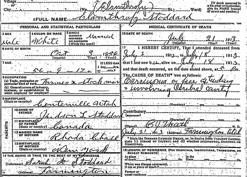 [12] Utah, U.S., Death and Military Death Certificates, 1904-1961 (index and images), death of Elamthrofy Stoddard, 21 July 1913, Farmington, Davis, Utah, certificate no. 336, https://ancestry.com, subscription database, accessed November 2020.