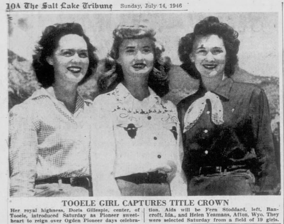 On 23 July 1946, Doris Gillespie announced that she was declining the grand prize for the Ogden Sweetheart competition.[21] According to her, “I think the Ogden celebration is wonderful in permitting girls from all over the state and from Idaho and Wyoming to enter the contest. The honor of being Ogden’s sweetheart for a week is reward enough.” She went on to explain that several weeks before the contest, she had enrolled at the University of Utah and therefore would not use the scholarship. In response to Doris’s announcement, the contest chairman declared that the $300 that would have been paid to the winner would be divided by her attendants. Even so, the division of the reward money was nowhere near equal.