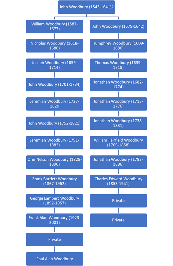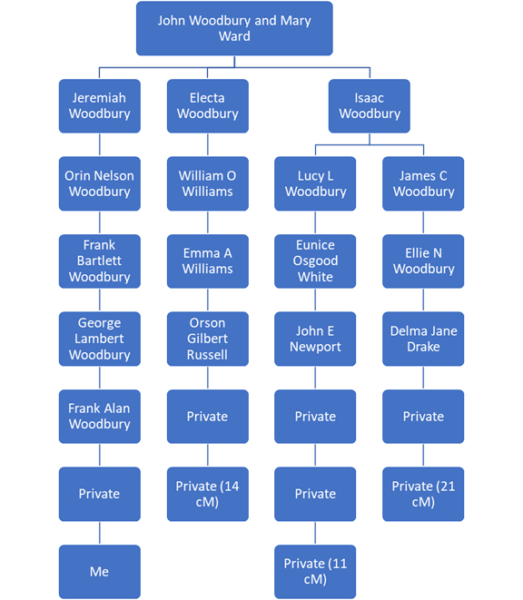 John Woodbury was my fifth great grandfather. I descend from him in the following line of ancestry: My grandfather, Frank Alan Woodbury (1923-2001), was the son of George Lambert Woodbury (1892-1957), son of Frank Bartlett Woodbury (1867-1962), son of Orin Nelson Woodbury (1828-1890), son of Jeremiah Woodbury (1791-1883), son of John Woodbury (1752-1821). In this case, documentary evidence provides a clear trail of evidence linking these proposed generations. Autosomal genetic evidence also supports these proposed generational linkages back to at least Jeremiah Woodbury, John’s son. Y-DNA evidence also provides some support for my proposed Woodbury ancestry back to the 1600s.