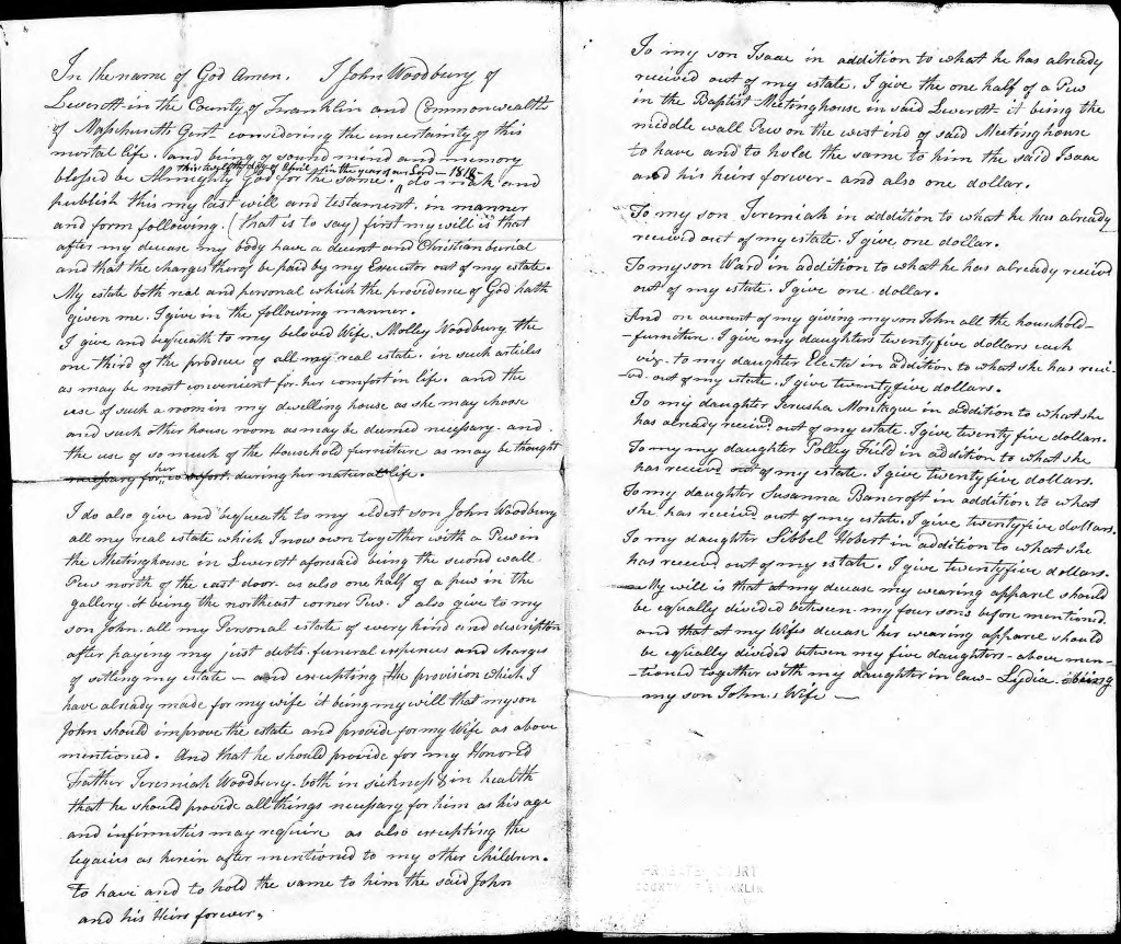 [7]Massachusetts, Wills and Probate Records, 1635-1991 (index and images), last will and testament of John Woodbury, 12 April 1818, Leverett, Franklin, Massachusetts, probated 18 December 1821, https://www.ancestry.com, subscription database, accessed July 2020.
